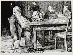 Thomas und Gerda Buddenbrook haben ihre erste „Mittagsgesellschaft“ gegeben. Das Dinner zog sich von fünf bis elf Uhr hin. An der Börse sprach man acht Tage lang „in den lobendsten Ausdrücken“ davon. „Wahrhaftig, es hatte sich gezeigt, dass die junge Frau Konsulin“[14] „zu repräsentieren verstand.“