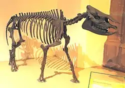 Im „Littorinellenkalk“[4] (entspricht den Inflata-Schichten und den Hydrobien-Schichten der moderneren Nomenklatur) des Mainzer Beckens bei Budenheim wurde 1911 ein etwa 20 Millionen Jahre altes Nashornskelett aus dem frühen Miozän entdeckt. Es handelt sich um ein weitgehend vollständiges, 85 cm hohes Exemplar der ausgestorbenen, hornlosen, tapirähnlichen Art Protaceratherium minutum.[5] Ursprünglich wurde das Budenheimer Nashorn als Vertreter der Spezies Rhinoceros (Ceratorhinus) tagicus bestimmt,[4] womit die Annahme verknüpft war, es sei ein enger Verwandter des rezenten Sumatra-Nashorns (Dicerorhinus sumatrensis – der Gattungsname Ceratorhinus ist ein jüngeres Synonym von Dicerorhinus). Eine Stellung in der „primitiven“ Gattung Protaceratherium schließt eine engere Verwandtschaft mit den rezenten Nashörnern aber aus.
