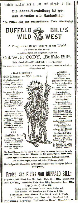 - ↑ Kölnische Zeitung. Köln 17. September 1890, S. 6 (deutsch: Städtische Nachrichten (au)s Köln.): „Bald waren die rings um den erweiterten Rennplatz aufgeschlagenen Tribünen, welche 8000 Sitzplätze enthalten, gut, auf den meisten Stellen dicht besetzt und alles harrte der Dinge, die da kommen sollten. Das Publicum war natürlich infolge der Ankündigungen in öffentlichen Blättern und durch Placate, infolge der Hinweise auf die belobenden Berichte über die Vorstellungen in andern Städten u. s. w. sehr gespannt. (...) Um halb drei Uhr öffnete sich ein Vorhang, der den Rennplatz nach Westen hin abgrenzte, und aus ihren abseits errichteten Zelten hervor ritten in die Arena, bunt geschmückt, in wildem Jagen, eine Truppe Arraphoes-Indidaner. (...) Nunmehr wickelte sich das ausgiebige Programm glatt und ohne Störung ab. Jede Nummer desselben bot Neues, manchem Zuschauer noch nie Gesehenens, jedem Interessantes. Bald legten einzelne erstaunliche Proben ihrer Schießkunst ab, bald zeigten bei Wettrennen, Angriffen und Kämpfen, beim Einfangen der Pferde und auf einer Büffeljagd die Indianer wie die Kuhhirten, nicht weniger auch die Damen, eine Tüchtigkeit im Reiten, eine Herrschaft über die unbändigen Pferde, wie wir sie bei unsern ausgezeichneten und kühnsten Reitern wohl vergebens suchen würden. Schützen – auch ein junges Mädchen – trafen vor- und rückwärts schießend mit Gewehr, Pistole und Revolver in die Luft geschnellte Gegenstände, einen, zwei, drei und vier, die zu gleicher Zeit in die Höhe geworfen wurden. Zwei, ein junger Cowboy und ein Herr Daly, schossen sogar auf dem Rücken liegend und auf dem Kopf stehend, der erstere mit der Büchse, der letztere mit Revolver und Pistole, die mit einer Wurfmaschine aufgeschnellten Kugeln. Buffalo Bill erfreute sich stürmischen Beifalls, als er in einem Galoppritt die ihm von einem anderen Reiter in die Luft geworfen Kugeln im Schnellfeuer zerschmetterte.“
