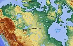 Der Buffalo Lake liegt 50 km südlich des am Großen Sklavensee gelegenen Orts Hay River. Der See liegt auf einer Höhe von 265 m und hat eine Fläche von 612 km².[1] Die Längsausdehnung in WSW-ONO-Richtung beträgt 49 km. Die maximale Breite liegt bei 13 km. Der Buffalo Lake wird vom Buffalo River in nördlicher Richtung zum Großen Sklavensee hin entwässert. Der Ostteil des Sees liegt im Wood-Buffalo-Nationalpark.
