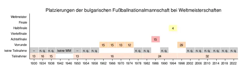 Der Artikel beinhaltet eine ausführliche Darstellung der bulgarischen Fußballnationalmannschaft bei Weltmeisterschaften. Bulgarien nahm bisher siebenmal an der WM-Endrunde teil und erreichte 1994 mit dem vierten Platz die beste Platzierung, nachdem zuvor in 17 WM-Spielen kein Sieg gelang.
