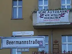 Gegen den Ausbau haben sich neben mehreren Anwohnerinitiativen die Bürgerinitiative BISS (Bürgerinitiative Stadtring Süd), das Aktionsbündnis A 100 stoppen! und die Bürger*innenInitiative A100 [49] gegründet. Sie organisierten zahlreiche Protestaktionen wie beispielsweise eine Fahrraddemonstration am 19. April 2009 mit 1500 Teilnehmern[50] oder Aktionen wie einen Flashmob auf einer Kreuzung an der Oberbaumbrücke am 21. Juni 2010.[51] Die Initiative Wirtschaft pro A100 setzt sich dagegen für den Weiterbau ein.