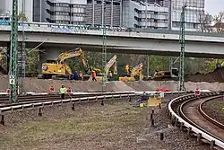 Als Bauvorleistung wurden beim Umbau des Bahnhofs Ostkreuz ab 2006 bereits Schlitzwände gegraben, wodurch Betonwände mit einer Dicke von 1,2 m und einer Tiefe von 24 m im Boden entstanden. Diese wurden mit einer Betondecke von zwei Meter Dicke versehen, auf der dann der Bahnhof entstand.[41] Die Tunnelvorleistung am Ostkreuz bildet für die mögliche Trassierung des Bauabschnitts einen Zwangspunkt.[38] Die Kosten für diesen Abschnitt wurden 1999 auf 286,3 Millionen Euro geschätzt (bis Frankfurter Allee). Eine aktualisierte Kostenschätzung im Zuge der Anmeldung zum Bundesverkehrswegeplan 2015 veranschlagte diese Ende 2013 mit 531,2 Millionen Euro.[43] Für die Vorleistungen am Bahnhof Ostkreuz waren zusätzlich zu diesem Bedarf bereits 16,3 Millionen Euro im Investitionsrahmenplan vorgesehen.[44]
