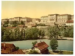 Mit dem Inkrafttreten der Bundesverfassung entstand am 12. September 1848 der moderne schweizerische Bundesstaat, doch die Hauptstadtfrage blieb zunächst ungeklärt. Am 28. November 1848 entschied sich die Bundesversammlung im ersten Wahlgang für Bern als Bundesstadt und somit als Sitz der Bundesbehörden (de jure kennt die Schweiz bis heute keine Hauptstadt).[5] Für die zentrale Unterbringung von Regierung, Parlament und Bundesverwaltung gab es in Bern noch kein geeignetes Gebäude, weshalb provisorische Lösungen erforderlich waren. Der Bundesrat erhielt den Erlacherhof an der Junkerngasse zur Verfügung gestellt, der Nationalrat versammelte sich im 1821 erbauten, «Casino» genannten Musiksaal und bei Bedarf im Berner Rathaus, während der Ständerat im Rathaus zum Äusseren Stand an der Zeughausgasse tagte. Bundesgericht und -verwaltung bezogen verschiedene Häuser in der Altstadt.[6]