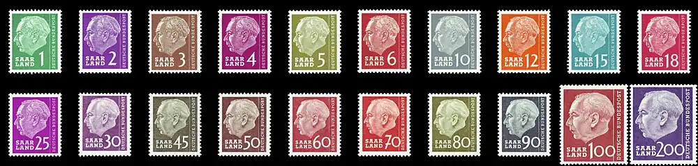 1957 wurde daher ebenfalls die Serie „Theodor Heuss“ in Franc-Währung, jedoch ohne einen Hinweis auf die verwendete Währung, bzw. ohne den Buchstaben „F“ mit der Inschrift „Saarland“ herausgegeben. Die Werte bis 25 Franc waren im Buchdruck, die Werte ab 30 Franc im Stichtiefdruck gedruckt; ab 100 Franc hatten sie auch ein größeres Format. Die Ausgaben ohne Währungsbezeichnung wurden am 30. Juni 1958 ungültig.