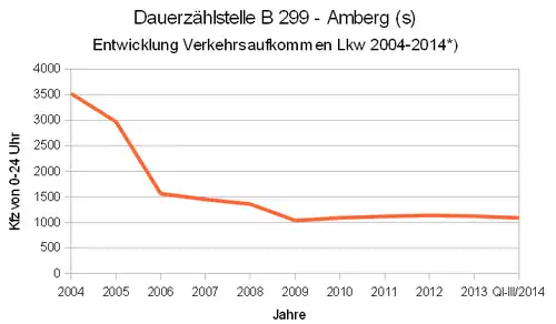 An der B 299 gibt es derzeit nur eine Dauerzählstelle: Nummer 9292 Amberg (s). Das Verkehrsaufkommen hat dort von durchschnittliche 12.000 Fahrzeugen täglich im Jahr 2004 auf 10.000 im Jahr 2014 abgenommen. Der Anteil des Schwerlastverkehrs ist von 2004 mit durchschnittlich 3.500 Lkw pro Tag um mehr als zwei Drittel auf etwa 1.000 im Jahr 2014 zurückgegangen. Der größte Rückgang war dabei in den Jahren 2004 bis 2006 zu verzeichnen. Seit 2009 ist das Verkehrsaufkommen nahezu konstant geblieben.
