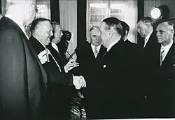 Kundgebung und Mitgliederversammlung des BDI, Frankfurt am Main, Mai 1957: Bundeswirtschaftsminister Ludwig Erhard und BDI-Hauptgeschäftsführer Wilhelm Beutler