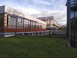 Das auch infolge der deutschen Wiedervereinigung gewachsene Arbeitsaufkommen und die große Entfernung zur neuen Bundeshauptstadt Berlin führten zu neuen Überlegungen bezüglich einer Erweiterung oder eines Umzugs des Gerichts. Die politische Forderung nach einer Verlegung in die neuen Länder nach Leipzig setzte sich nicht durch. Erweiterungs- und Umbauplanungen waren umstritten, da sowohl das Gerichtsgebäude als auch der angrenzende Botanische Garten denkmalgeschützt sind.[35][36] Wegen der Raumnot wurde der westliche Anbau des Schlosses als Registratur genutzt und 1992 über einen unterirdischen Verbindungsgang ans Gericht angebunden. 1995 wurde das bis zu dem Zeitpunkt für die Bevölkerung zugängliche Casino in Mitarbeiterräume umgewandelt und die Bibliothek erhielt zusätzliche unterirdische Tiefmagazine.[31][37] Im Jahr 2000 stimmten die Verfassungsrichter mehrheitlich für den Verbleib am Standort Karlsruhe.[38] 2007 wurde am südwestlichen Rand des Gebäudekomplexes ein kompakter Erweiterungsbau nach Plänen des Architekten Michael Schrölkamp fertiggestellt, der eine Teilfläche des Botanischen Gartens überbaute.[39] Von Juli 2011 bis September 2014 dauerte eine Grundsanierung unter Beibehaltung des Erscheinungsbildes und technische Modernisierung des Gebäudeensembles am Dienstsitz Schlossbezirk. Die Kosten betrugen 55 Millionen Euro.[40] Die beiden Senate, die wissenschaftlichen Mitarbeiter und das Funktionspersonal des Gerichts (zusammen ca. 120 Mitarbeiter) zogen für diesen Zeitraum in drei ehemalige Stabsgebäude des Kommandos der 1. Luftwaffendivision der Bundeswehr um. Den nach dem Karlsruher Stadtteil Waldstadt benannten temporären Dienstsitz in der General-Kammhuber-Kaserne gestalteten die Stuttgarter Architekten Lederer+Ragnarsdóttir+Oei und das Staatliche Hochbauamt Baden-Baden.[41] Das Verwaltungspersonal verblieb überwiegend am Stammsitz.[42][43]