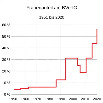 Mit dem Bundesverfassungsgericht (BVerfG)[15] sah ab 1949 das Grundgesetz für die Bundesrepublik Deutschland (GG) eine juristische Infrastruktur sui generis vor. Anders als beispielsweise der US Supreme Court ist das Bundesverfassungsgericht auf verfassungsrechtliche Streitigkeiten spezialisiert und beschränkt. Es folgt darin dem österreichischen Modell der Verfassungsgerichtsbarkeit von 1920.[16] Zwei Jahre nach Inkrafttreten des Grundgesetzes nahm das Gericht seine Arbeit 1951 auf, seinerzeit bestehend aus zwei mit jeweils zwölf Richtern besetzten Senaten, die je zur Hälfte vom Bundestag und Bundesrat gewählt wurden. Innerhalb der folgenden zwölf Jahre wurde die Zahl der Richter in den beiden Spruchkörpern sukzessive reduziert, 1956 auf zehn, 1963 auf acht. Den Hintergrund hierfür bildete ein zähes Ringen der Parteien um die politische Mehrheit, bei der Adenauers CDU letztlich die Oberhand gewann.[13]