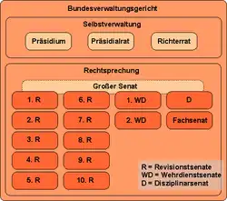 Beim Bundesverwaltungsgericht sind derzeit 14 Senate eingerichtet: elf Revisionssenate, zwei Wehrdienstsenate und ein Fachsenat (zu letzterem: § 189 i. V. m. § 99 Abs. 2 VwGO). Früher existierten zudem drei Disziplinarsenate, die 1971, 2004 und 2015 aufgelöst wurden. Bei den Revisionssenaten sind fünf bis sieben Berufsrichter eingesetzt; Entscheidungen ergehen in der Besetzung von fünf Richtern, bei Beschlüssen außerhalb der mündlichen Verhandlung in der Besetzung von drei Richtern (§ 10 Abs. 3 VwGO). Bei den Wehrdienstsenaten sind drei Berufsrichter eingesetzt; sie entscheiden im Falle mündlicher Verhandlung unter Hinzuziehung zweier ehrenamtlicher Richter aus dem Kreis der Bundeswehr. Beim Fachsenat sind, parallel zu ihrer Zugehörigkeit zu einem der anderen Senate, vier Berufsrichter eingesetzt; er entscheidet in der Besetzung mit drei Richtern. Am Bundesverwaltungsgericht sind insgesamt 59 Berufsrichter planmäßig tätig.
