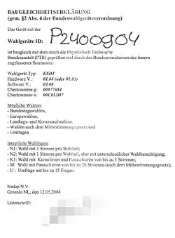 Die erste Bauartzulassung war am 31. Mai 1999 wurde von der nach BWahlGV für die Prüfung der Wahlgeräte zuständigen Physikalisch-Technischen Bundesanstalt (PTB) erteilt worden. Die Akkreditierung der PTB als Softwareprüflabor erfolgte erst 2001.[3] Die einzigen in Deutschland zugelassenen Geräte nach dieser Verordnung waren die Typen ESD1 und ESD2 der Firma niederländischen Firma Nedap. Unter Berufung auf ihr Urheberrecht konnte Nedap die vollständige Akteneinsicht in die Prüfunterlagen der PTB gemäß Informationsfreiheitsgesetz verhindern.