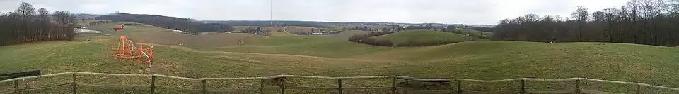 vorne links die Bergstation des Schlepplifts, mittig hinten der Mast des Senders Bungsberg