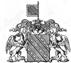 Das Stammwappen zeigt drei blaue Schrägrechtsbalken auf rotem Grund, die beiden äußeren mit je vier, der mittlere mit fünf silbernen gestürzten „vairs“ (Eisenhütchen, Feh) belegt (eine frühe Variante zeigt den Schild fünfmal schrägrechts geteilt, so dass dort das unterste rote Feld fehlt); auf dem Helm mit rot-silbernen Decken eine goldengefranste Fahne mit dem Schildbild an von Rot und Silber mehrfach schrägrechts geteilter Stange.