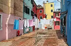 Typisch für Burano sind die vielen kleinen in jeweils einer zu den Nachbarhäusern kontrastierenden kräftigen Farbe gestrichenen Fischerhäuser, die sich in den Kanälen spiegeln und die die Individualität der jeweiligen Hausbesitzer betonen. Die kuriose Farbenpracht zieht viele Maler und Fotografen auf die Insel.