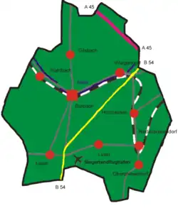 Durch das Gemeindegebiet verläuft im Nordosten die Autobahn A 45 (Sauerlandlinie). Zudem wird das Gemeindegebiet im Osten von der B 54 erschlossen, die von Siegen kommend in Richtung Limburg an der Lahn verläuft.