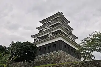 Aus der Edo-Zeit erhalten geblieben sind im Hommaru der Küchen-Wachturm und der „Geländer-Wachturm“ (高欄櫓, Kōran-yagura), im Ni-no-maru der Owata-Wachturm (苧綿櫓, Owata-yagura) und im San-no-maru der „Südeck-Yagura“ (南隅櫓, Minamisumi-yagura) und die „Untere Küche“ (下台所, Shimo daidokoro). Im Jahr 2004 wurde zur Fünfzigjahrfeier der Einstufung als Stadt der Burgturm nach alten Unterlagen in Holzbauweise originalgetreu wieder aufgebaut. Zusammen mit dem Burgturm wurden auch das Innere des Geländer-Wachturms und des Küchen-Wachturms im selben Jahr der Öffentlichkeit zugänglich gemacht.