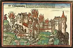 In der Mitte des 16. Jahrhunderts entführte der Raubritter Hans Thomas von Absberg Kaufleute aus Reichsstädten in Franken, Schwaben und dem Egerland im ehemaligen Nordgau (Bayern) auf ihren Handelsreisen, verlangte ein hohes Lösegeld für ihre Freilassung und raubte die Handelsgüter. Er hatte dabei Verbündete, die ihn bei seinen Raubzügen unterstützten und ihn bei Gefahr der Gefangennahme auf ihren Burgen versteckten. Auch die Herren von Guttenberg, Lehensträger der Burg Alt- und Neuguttenberg, gehörten dazu, da sie hofften, ihre schwindenden Einkünfte wieder aufstocken zu können. 1523 sandte der Schwäbische Bund von Handelsstädten unter Führung des Truchsess Georg von Waldburg ein Aufgebot von 1672 Berittenen und 10535 Fußkämpfern aus,[1] um 23 „Raubnester“ dem Erdboden gleichzumachen, an 18. und 19. Stelle auch die Burgen der Guttenberg. Am 5. Juli erreichten und besetzten sie die Anlage und äscherten sie am 8. Juli ein, um die Rückkehr derer von Guttenberg und weiterer dort ansässiger Raubritter zu verhindern und dem Raubwesen ein Ende zu bereiten. Auf einem Holzschnitt aus dem Jahr 1523 ist eine Ansicht der zerstörten Burganlage in Guttenberg dargestellt.
