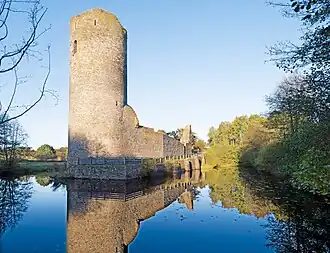 ![]() Burg Baldenau von Südwest mit dem 24 m hohen Bergfried und dem Wassergraben | |