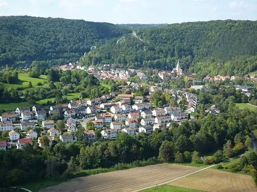 Sicht auf Blaubeuren, im Hintergrund ist der Felsgrat, der einst die Burg trug, erkennbar | ||