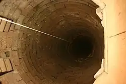 Die früheste Wasserversorgung der Burg erfolgte über eine Zisterne, die erstmals 1357 urkundlich erwähnt wurde. Mit der Nutzung als Residenz ab dem 15. Jahrhundert reichte dies für eine vergrößerte Burgbesatzung mit Bediensteten und Pferden nicht mehr aus. Deshalb entschloss man sich, einen Brunnenmeister mit dem Bau zu beauftragen, der mit dem Aussterben der Grafen von Wertheim 1556 noch nicht abgeschlossen war. Eine Nische am unteren Ende des gemauerten Teils des Brunnenschachtes war möglicherweise zur Anlage eines Geheimganges aus der Burg vorgesehen. Während der Arbeiten wurde vielleicht ein Stollen zum Ausbringen des Aushubs genutzt. Nur der obere Teil des Schachtes ist aus großen Quadern gemauert, der untere Teil wurde durch den Sandsteinfels getrieben. Die Arbeiten fanden 1560 mit dem Bau der achteckigen Brunneneinfassung ihren Abschluss.[24]