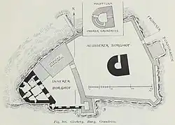 Die erhöht liegende, in etwa dreieckige Grundfläche der Burganlage wurde ehemals von einer Ringmauer umschlossen und lässt Reste einer Vorburg erkennen. Noch um 1900 war ein vor dem ehemaligen Palas gelegener kleinerer innerer Hof abgeteilt vom Burghof um den Bergfried. Dessen Zugang bzw. Zufahrt besteht über den früheren Burggraben von Süden her. Das hufeisenförmige Palasgebäude liegt an der nördlichen Spitze der Anlage. Sein Halbrund korrespondiert mit dem ebenfalls talwärts nach Norden zu halbrund ausgeführten Bergfried, von dessen früherer Höhe – über 33 Meter als steinerner Turm plus etwa 9 Meter hölzerne Aufbauten – heute noch 20,60 Meter übrig sind.