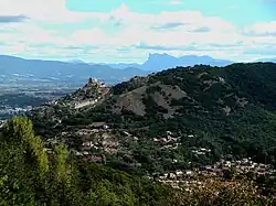 Die Burgruine steht auf einem 337 Meter[15] hohen Kalkfelsen[16], der die Gemeinde Guilherand-Granges um etwa 200 Meter[15] überragt. Das Burgareal gehört jedoch zu der westlich der Ruine liegenden Gemeinde Saint-Péray. Der strategisch günstig gewählte Burgplatz ermöglichte die Kontrolle des Rhônetals und der Grenze Frankreichs, die der Fluss bis in das 14. Jahrhundert zum Heiligen Römischen Reich bildete. Außerdem führte dort die Straße von Valence nach Le Puy-en-Velay und damit ein Jakobsweg nach Santiago de Compostela vorbei. Die Kernburg der nur unmotorisiert zu erreichenden Anlage steht auf einem kleinen Felsplateau, das an seiner östlichen Seite steil ins Tal abfällt. Vom Plateau bietet sich ein Blick, der sich über die Gebiete von vier verschiedenen Départements erstreckt: Von den Alpen im Osten zu den Cevennen im Westen, und vom Mont Pilat im Norden bis zum Mont Ventoux im Süden.[17]