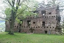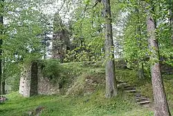Erhalten ist ein Teil der Außenmauer des runden Palas.