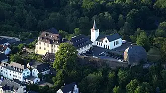 ![]() Burgberg von Süden: Rechts die Zehntscheune, Evangelische Kirche, links Amtshaus, Luftaufnahme (2015) | ||
