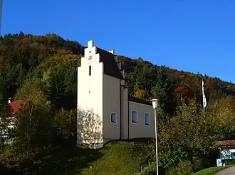 Es wird vermutet, dass die Ortskirche St. Nikolaus mit ihrem mächtigen Treppengiebel Teil einer Burg gewesen ist. Das Bauwerk liegt auf einem steil geböschten Hügel über der Petrusquelle[1] an der Straße nach Zell. Die Kirche ist aus sorgfältig bearbeiteten Kalksteinquadern errichtet. An dem Turm der Kirche befindet sich in 4,5 m Höhe eine Tür, außerdem ein Strebpfeiler mit einem Kragstein, der Rest eines älteren Langhauses gewesen sein könnte.