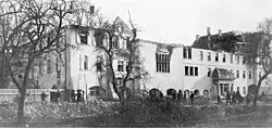 1820 stürzte ein Teil des großen Turms ein,[16] denn er war 1770 durch Blitzschlag schwer beschädigt und danach nicht repariert worden. 1820 wurden seine Reste vollständig niedergelegt. Am 19. Februar 1839 kam auf der Burg der bekannte Kulturpolitiker Friedrich Althoff zur Welt. Seine Familie mütterlicherseits, die Familie von Buggenhagen, besaß das Dinslakener Kastell zu jener Zeit in der zweiten Generation. 1853 verkaufte sie die Burg an Friedrich de Fries, der sie landwirtschaftlich nutzte und in den Gebäuden eine Schnapsbrennerei einrichtete. 1859 gab es Pläne, die Anlage als Irrenanstalt zu nutzen, sie wurden aber wieder fallengelassen. Auch das Vorhaben, dort eine Fortbildungsschule unterzubringen, wurde nicht verwirklicht. 1906 erwarb die Stadt Dinslaken die Burganlage und ließ sie von 1907 bis 1909 umbauen, um sie anschließend als Sitz der Kreisverwaltung nutzen zu können. Dabei wurde nicht nur im Nordwestflügel eine Wohnung für den Landrat eingerichtet, sondern auch Wirtschaftsgebäude niedergelegt, um an ihrer Stelle ein neues Gebäude mit Verwaltungsräumen und Sitzungssaal zu bauen. Im April 1909 sollte der Verwaltungsbetrieb aufgenommen werden, doch in der Nacht vor der Einweihung brannte die Anlage vom 6. auf den 7. April 1909 nieder. Der Wiederaufbau erfolgte sofort, und im Herbst desselben Jahres konnte die Kreisverwaltung ihr neues Domizil beziehen.[17]