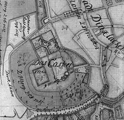 Die klevische Katasterkarte aus dem Jahr 1734 zeigt die Burg Dinslaken noch als Dreiflügelanlage, die ringsum von breiten, vom Rotbach gespeisten Wassergräben umgeben ist. Der Burggraben schloss im Norden eine viereckige Garteninsel mit ein. Zusätzlich lag östlich des Burggrabens ein formaler Garten. Der zweigeschossige Nordostflügel stammte wohl aus der ersten Hälfte des 16. Jahrhunderts und besaß Staffelgiebel sowie an der Hofseite einen Treppenturm. Der zweigeschossige Nordwestflügel mit seinen hohen Fenstern war vielleicht im 17. Jahrhundert errichtet worden. Er besaß ein Walmdach mit kleinem Dachreiter. Markantestes Bauteil der Burg war jedoch seit dem 15. Jahrhundert der runde Hauptturm, dessen Höhe auf 40 Meter geschätzt wird.[18] Er bestand aus drei Partien, deren Mauerwerk vermutlich aus Backstein bestand[7] und die mit zunehmender Höhe einen kleineren Durchmesser hatten. Sie besaßen alle gedeckte, vorkragende Wehrgänge und waren früher vermutlichen von einem spitzen Helm abgeschlossen.[19] Der Turm beherbergte lange Zeit ein Gefängnis, in dem auch peinliche Befragungen vorgenommen wurden, denn die Burg Dinslaken fungierte zugleich als Sitz eines Richters.
