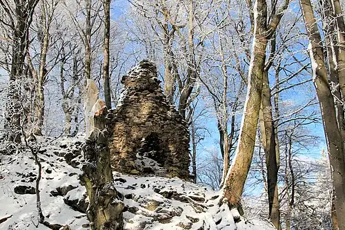 Von der einstigen Burganlage haben sich nur Mauerreste und ein Torbogen erhalten.