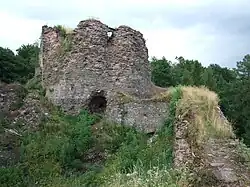 Von der durch eine zehn Meter hohe Mauer umgebenen und aus einer Burg und Vorburg bestehenden Anlage sind der teilweise abgerutschte Bergfried sowie Mauerreste des Burgtores erhalten.