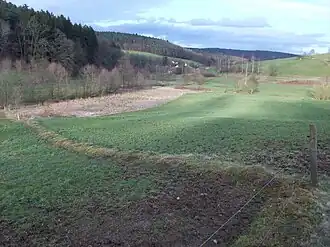 vermutete Lage des Burgstalls zwischen Mösselbach (links) und Güttersbach (rechts) nördlich des Ortsausgangs von Güttersbach | ||