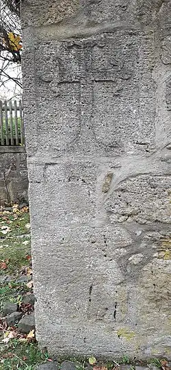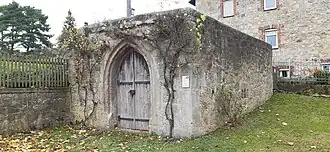 Erhalten blieben der Torbogen und ein gewölbter Keller aus Bruchsteinen. An der südwestlichen Ecke des Zugangs des kleinen Bruchsteinkellers mit Spitzbogenportal und Tonnengewölbe befand sich an einem Eckstein auf Kopfhöhe ein gemeiseltes Kreuz in der Ecksteinquaderung; an der Längsseite eine Dreierreihe Schießscharten. Ihre Lage zeigt, dass das Bodenniveau im Mittelalter viel tiefer war.