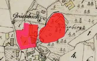 ![]() Lageplan von Burg (links) und Schloss Grünbach (rechts) auf dem Urkataster von Bayern | ||