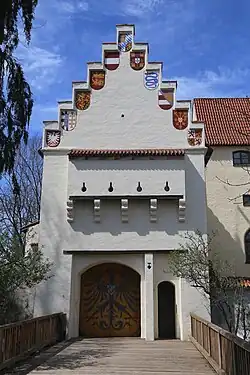 Seit dem Teilabbruch ist die Veste eine unregelmäßige Rechteckanlage, die durch einen Zwinger mit einem Rundturm und einen tiefen, winkelförmigen Halsgraben mit vorgelegtem Erdwall geschützt wird. Man betritt die Burg im Südosten durch einen vorspringenden Torturm, dessen Stufengiebel mit einem Wappenzyklus von 1486/87 (erneuert) geschmückt ist. Das Wappen Bayern – Pfalz des damaligen Burgherrn Albrechts IV. befindet sich im obersten Stufenfeld, die Wappenbilder darunter vertreten die durch Einheirat in das Haus Wittelsbach verwandten Adelshäuser[4][5].