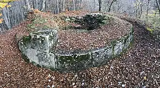 Mit Buckelquadern verkleidete Grundmauer des Bergfrieds