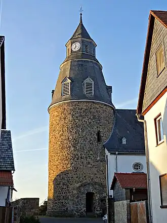 Die Burg bestand wohl nur aus einem Festen Haus (Steinhaus) neben einem nicht miteinander verbundenen Bergfried. Der runde Bergfried der Burg diente später als wehrhafter Chorturm der Kirche zum Schutz der Bürger und stammt vermutlich aus der zweiten Hälfte des 14. Jahrhunderts. Noch 1695 wird der Bergfried mit Spitzdach und 2 Ecktürmchen dargestellt.[5] Das ganze war durch einen Burggraben gesichert, der noch bis 1835 existiert hat, denn in diesem Jahr wurde er verfüllt. Nach Angaben des Geschichtsvereins Butzbach war die Burg noch bis 1926 in fürstlichem Besitz und wurde erst danach an wechselnde Besitzer verkauft. Im Ort existierten weitere Adels- bzw. Junkerhöfe.[6]