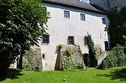 Östlich des Torturms ist ihm ein zweigeschoßiger Bau angefügt, dessen Walmdach ebenfalls aus der zweiten Hälfte des 17. Jahrhunderts stammt.[3] Die sich daran südlich anschließenden Bauten an der Ostseite der Vorburg stammen aus dem 20. Jahrhundert. Früher war diese Seite nur von einer Wehrmauer abgeschlossen. Hauptflügel der Vorburg ist der langgestreckte zweigeschoßige Trakt an der Westseite mit einem Wellenbandfries auf Traufgesimshöhe und mächtigen Stützmauern. Dieser Teil der Vorburg stammt im Kern aus dem 16. Jahrhundert.[3] Entsprechend datieren die Kreuzgratgewölbe in seinem Inneren in dieselbe Zeit.