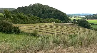 ![]() Bewaldeter Burgberg, rechts das Leinetal | ||