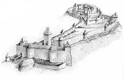 ![]() Ansicht vom dritten Burghof auf den Palas (Ruine) Burg Helfštýn (2005) | ||