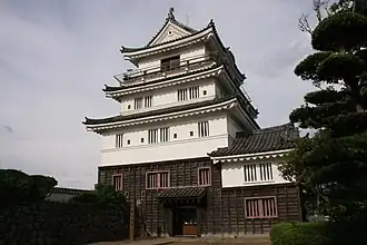 1962 wurde ein Burgturm auf den Fundamenten des vormaligen Okimi-Wachturms (沖見櫓, Okimi-yagura) errichtet. Weiter wurden die Wachtürme Inui-yagura (乾櫓)[A 1], Jizō-yagura (地蔵櫓), Kensō-yagura (見奏櫓) und Kaijū-yagura (懐柔櫓) nachgebaut.