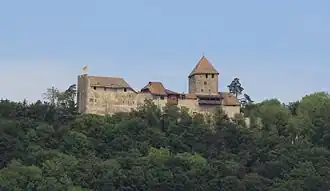Aus den Anfangszeiten der Burg um 1220 stammen die Ringmauer sowie der Palas im Westen. Für den Bau wurden auch Hölzer aus dem um 1212 abgebrochenen Vorgängerbau verwendet. Zwischen 1250 und 1280 wurde der Palas im Osten erweitert, der Bau in der Mitte mit dem nördlich vorgelagerten Doppelzwinger mit Schiessscharten und zwei Toren sowie der Turm im Osten erstellt. Der 20 Meter hohe Bergfried weist eine quadratische Grundfläche mit rund 10 Meter Seitenlänge aus. Die Ecksteine sind mit sorgfältig gearbeitetem Kantenschlag ausgeführt. Der Hocheingang lag auf einer Höhe von 8,5 Metern. Der Bergfried wird heute als Aussichtsturm genutzt.
