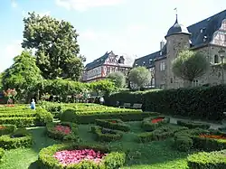 ![]() Fachwerkbau der Alten Burg (Oberburg) mit Altem Amtsgericht (mittig) und dem alten Bergfried, heute Hexenturm genannt | ||