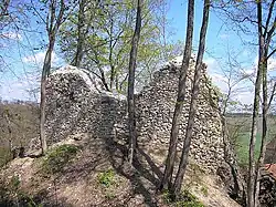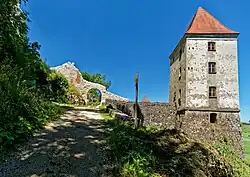 Das unregelmäßige Fünfeck der Außen- bzw. Zwingermauer war durch zwei viereckige und drei – möglicherweise ehemals vier – runde, vorspringende Türme bewehrt. Die Angriffsseite schützte ein winkelförmiger, ca. 5 Meter tiefer und 10 bis 16 Meter breiter Halsgraben. Das Tor lag im Süden nahe dem Steilabfall.