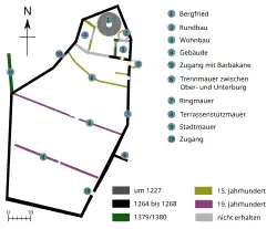 1330 verpfändete Ludwig der Bayer Burg und Stadt an den böhmischen König Johann, dem sie aber am 9. August 1336[2] nach kurzer Belagerung durch den Landvogt und die Reichsstände wieder abgenommen wurde. Fortan verwaltete ein kaiserlicher Vogt die Burganlage.[9] 1379/1380 erfolgte eine Erhöhung der Ringmauer um vier Meter.[10][11] Zugleich wurde 1380[12] an der Ostseite der Kernburg ein neuer, größerer Wohnbau errichtet. Die Anlage diente im Mittelalter noch häufiger als Pfandobjekt, so war sie zum Beispiel an Wenzel I. von Luxemburg und Konrad Stürtzel, den Kanzler Maximilians I., verpfändet.[13] 1444 widerstand sie erfolgreich einer Belagerung durch die Armagnacs.[14] Während die Unterburg wahrscheinlich schon im 15. Jahrhundert aufgegeben worden war, erfolgten im selben Zeitraum bauliche Veränderungen in und an der Oberburg.[15] Dazu zählten die Errichtung eines runden Baus zwischen Bergfried und Wohnbau und das Versetzen der Trennmauer zwischen Ober- und Unterburg nach Süden. Dabei wurde auch ein neues Burgtor in der Ostseite der Ringmauer ausgebrochen, das einen direkten Zugang zur Kernburg ermöglichte. Zuvor war dieser Bereich nur von der Unterburg aus erreichbar gewesen.