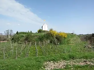 Burg Kenzingen – Burghügel mit „Kuppelburg“, davor der Halsgraben | ||