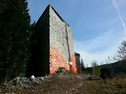 Den westlichen Abschluss und damit auch den am weitesten von der Kernburg entfernten Teil dieses Vorwerkes bildete ein nach Südwesten ausgerichtetes und etwa auf das 15. Jahrhundert datiertes Gebäude mit fächerförmigen Grundriss, welches in der Literatur mitunter auch als Wehrturm oder Bastion interpretiert wird und von dem nur mehr die Grundmauern erhalten sind.[3] Dieses Bauwerk wurde 1993 im Rahmen einer Grabung freigelegt, wobei auch das Mauerwerk teilweise wiederhergestellt und gesichert wurde. Die Mauer dieses Gebäudes erhebt sich rund 1,7 Meter über das rezente Bodenniveau und ist an der mit circa 4 Meter breitesten Gebäudestelle im Südwesten gerundet und etwas nach innen gewölbt. Diese Mauer ist die einzige bekannte rundlich verlaufende Mauer in der gesamten Burganlage. Von dieser Bogenmauer gehen die zwei anderen Gebäudemauern ab, die bei einem im Nordosten gelegenen Felsblock zusammenlaufen und dort bei einer Breite von etwa 1 Meter die schmälste Stelle des Gebäudes bilden. Die lichte Länge des Innenraumes beträgt rund 6,5 Meter. Die Dicke der Gebäudemauer schwankt zwischen 1 Meter und etwas über 1,5 Meter. Die gesamte Ostmauer sowie Teile der Nordmauer waren verstürzt und wurden im 20. Jahrhundert wiederaufgebaut. Der Innenraum des Gebäudes wird im Westen, bei der gebogenen Mauer, durch eine aus dieser Mauer ragende Zunge in zwei unregelmäßig geformte Bereiche oder Kammern unterteilt. Beide dieser Kammern sind kleiner als 2 Meter. Die südliche Kammer hat einen 0,53 Meter breiten Eingang, während dieser bei der etwa 20 Zentimeter tiefer gelegenen nördlichen Kammer eine Breite von 1,5 Metern aufweist. Bei beiden Eingängen wurden während Grabungsarbeiten Steinplatten gefunden, die als Schwellen interpretiert wurden. Im südlichen Gebäudeteil gibt es eine weitere kleinere und auch etwas höher gelegene Nische, deren Mauerwerk aber soweit durch Baumwurzeln zerstört wurde, dass es schwierig ist, deren ursprüngliche Form zu rekonstruieren. Da das Gebäude nur mehr in den Grundmauern erhalten ist, lässt sich seine ursprüngliche Nutzung und auch Funktion der Kammern nicht genau bestimmen. Wahrscheinlich dienten diese aber als Lagerräume und das Gebäude selbst hatte vermutlich eine Aussichts- und Wehrfunktion inne. Eine Nutzung als kleiner Geschützturm oder als Rondell erscheint aufgrund der gerundeten Gebäudeform möglich, muss aber allein schon wegen des Erhaltungszustandes des Gebäudes als reine Spekulation ohne sichere Belege gesehen werden.[30]