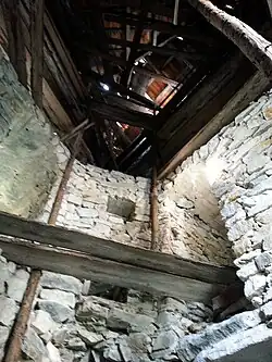 Der Innenraum des Bergfriedes hat nur im unteren Bereich einen dreieckigen Grundriss. Durch ein, in der westlichen Ecke in einer Höhe von 1,8 bis 2 Meter über den Boden eingezogenes Mauerstück entsteht dort eine unregelmäßig fünfeckige Form. Die Mauern haben auf der Innenseite in einer Höhe von etwa 2 Metern eine Länge von rund 5,1 Meter im Osten, 0,9 Meter im Nordosten, rund 3,8 Metern im Nordwesten, etwa 1,2 Meter im Westen und circa 3,9 Meter im Südwesten. Durch zwei senkrechte Lichtschlitze im unteren Teil der Nordwest- und der Südwestmauer gelangt Licht in das Innere des Bergfriedes. Der Lichtschlitz in der Südwestmauer wurde bei den seit den 1980er-Jahren erfolgten Renovierungsarbeiten ergänzt, da sich die Mauer in diesem Bereich in einem schlechten Erhaltungszustand befand. Die Lichtschlitze sind auf der Innenseite etwa 50 Zentimeter breit und verjüngen sich zur Außenseite hin auf eine Breite von 10 bis 20 Zentimeter. Im unteren Teil der Ostmauer haben sich Putzreste erhalten. Im original vorhandenen Mauerwerk findet man mehrere rund 10 bis 20 Zentimeter große, quadratische Löcher, die vermutlich die Balken der Zwischendecken trugen. In der nördlichen und westlichen Ecke des Bergfriedes befinden sich mehrere rund 50 hohe, 60 Zentimeter breite und zwischen 60 und 85 Zentimeter tiefe, in der Westecke zudem mit Steinplatten ausgelegte Nischen. Im zweiten Obergeschoß findet man an der Nordwestmauer zwei nach Nordwesten, also zur Außenmauer hin, führende Treppenstufen. Da diese Mauer nicht dick genug für eine vollständige Treppe ist, die ins nächste Obergeschoß führen könnte, dürften sie ursprünglich zu einer Nische mit einer Leiter, einem Erker oder einer erhöht gelegenen Fensteröffnung geführt haben.[39][40]